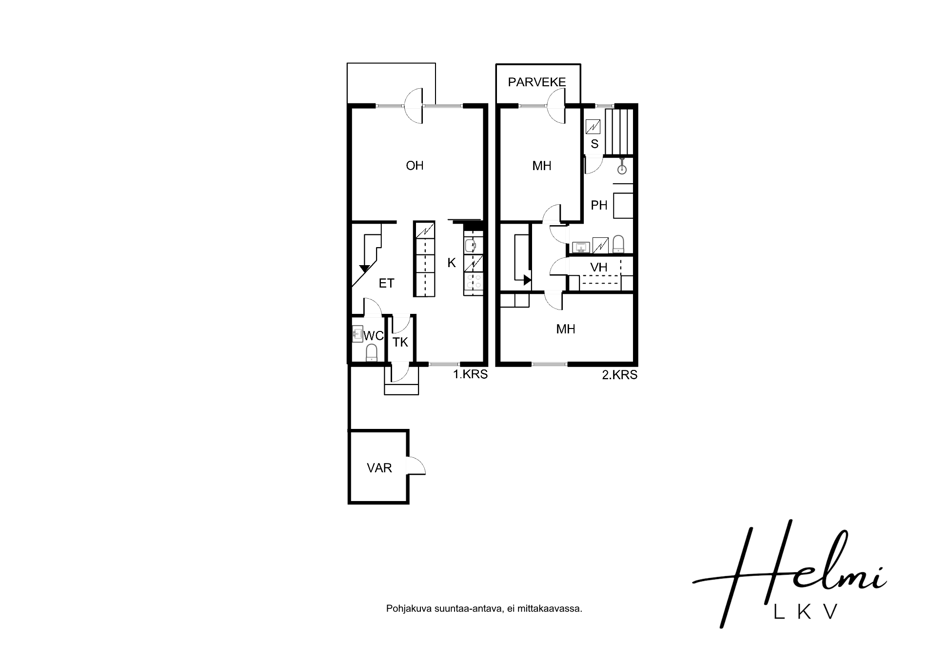 Tässä huoneistossa on kaksi kerrosta joista alakerrassa sijaitsee moderni keittiö, olohuone, josta käynti takapihan terassille, wc sekä eteistilat. Yläkerrassa sijaitsee kaksi makuuhuonetta, joista toisesta on käynti parvekkeelle, tilava vaatehuone sekä 2014 remontoitu kylpyhuone ja sauna.